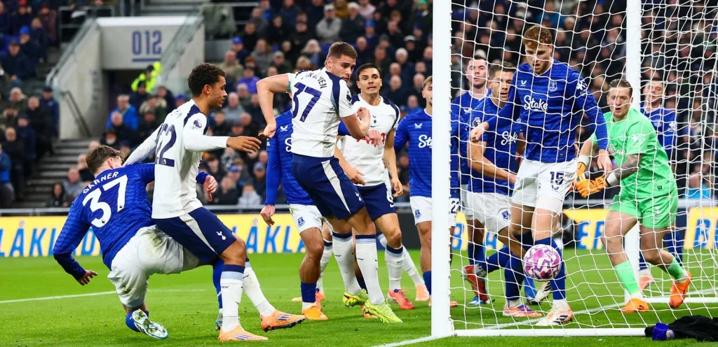 机会在两端不断出现,本坦库尔在 22 码处的半凌空抽射偏出不远处,而范德文刚刚触及恩迪亚耶的危险传中,阻止了贝托近距离射门,然后我们在半场结束时再进一球。在一连串的角球之后,波罗在乔丹·皮克福德的头顶上打进一球,范德文率先到达那里,将球送入网后。